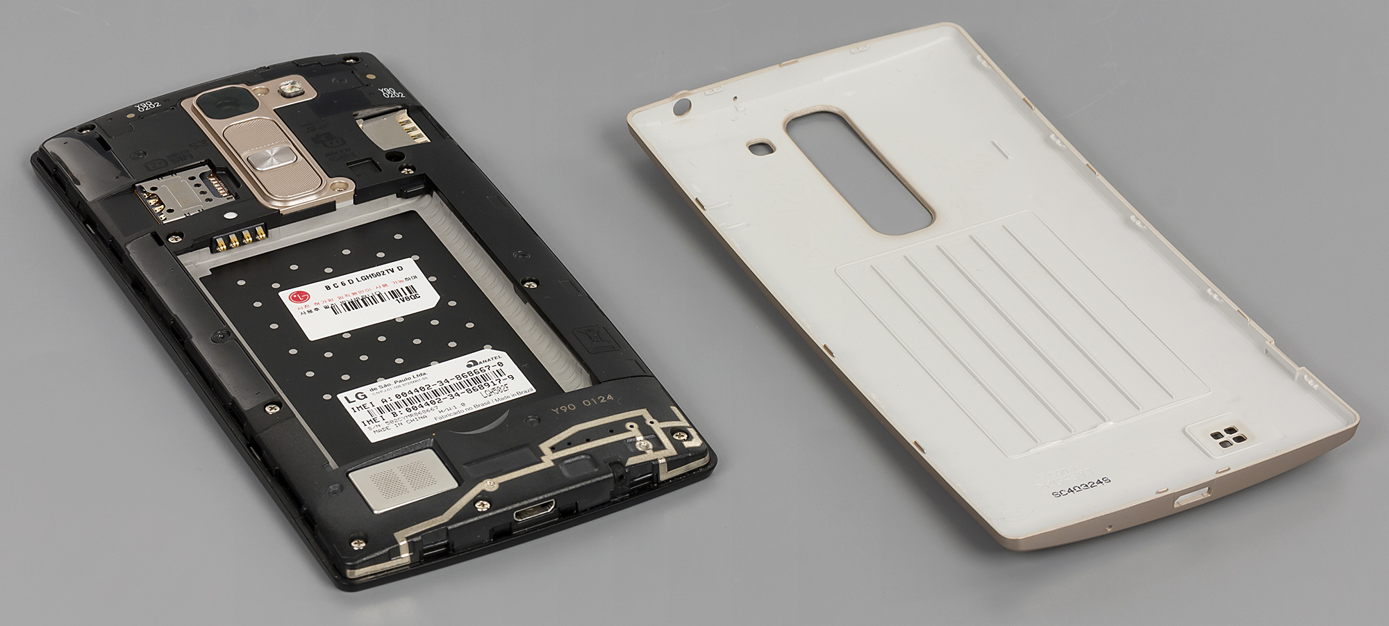 На внешней стороне задней панели аппарата привычно разместились окошко камеры, глазок одиночной светодиодной вспышки и решетка динамика. Надо заметить, что все перечисленные элементы выдержаны в едином «квадратном» стиле, в отличие, скажем, от того же LG G4: здесь даже отверстия прикрывающей динамик решетки — квадратной формы. Решетка приходится на изогнутый край корпуса, поэтому звук лежащего на твердой поверхности смартфона практически не приглушается.