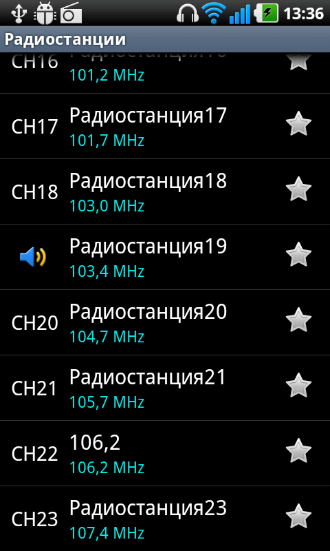 Встроенный радиоприемник FM-диапазона работает только при подключеных наушниках, которые выполняют роль антенны. Программа управления приемником выглядит несколько необычно: в центре находится большое колесо прокрутки, с помощью которого можно изменять частоту радиостанции пошагово. Ввести частоту с клавиатуры можно лишь при добавлении станции в память. Ячеек памяти, похоже, неограниченное количество, так как они добавляются по мере ввода новой частоты или при автоматическом поиске.