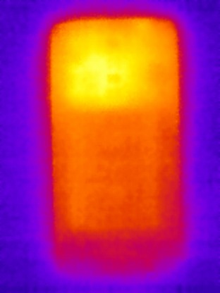 Видно, что нагрев выраженно локализован в верхней части аппарата, что, видимо, соответствует расположению микросхемы SoC. По данным теплокамеры, максимальный нагрев составил 41 градус, это средний нагрев.