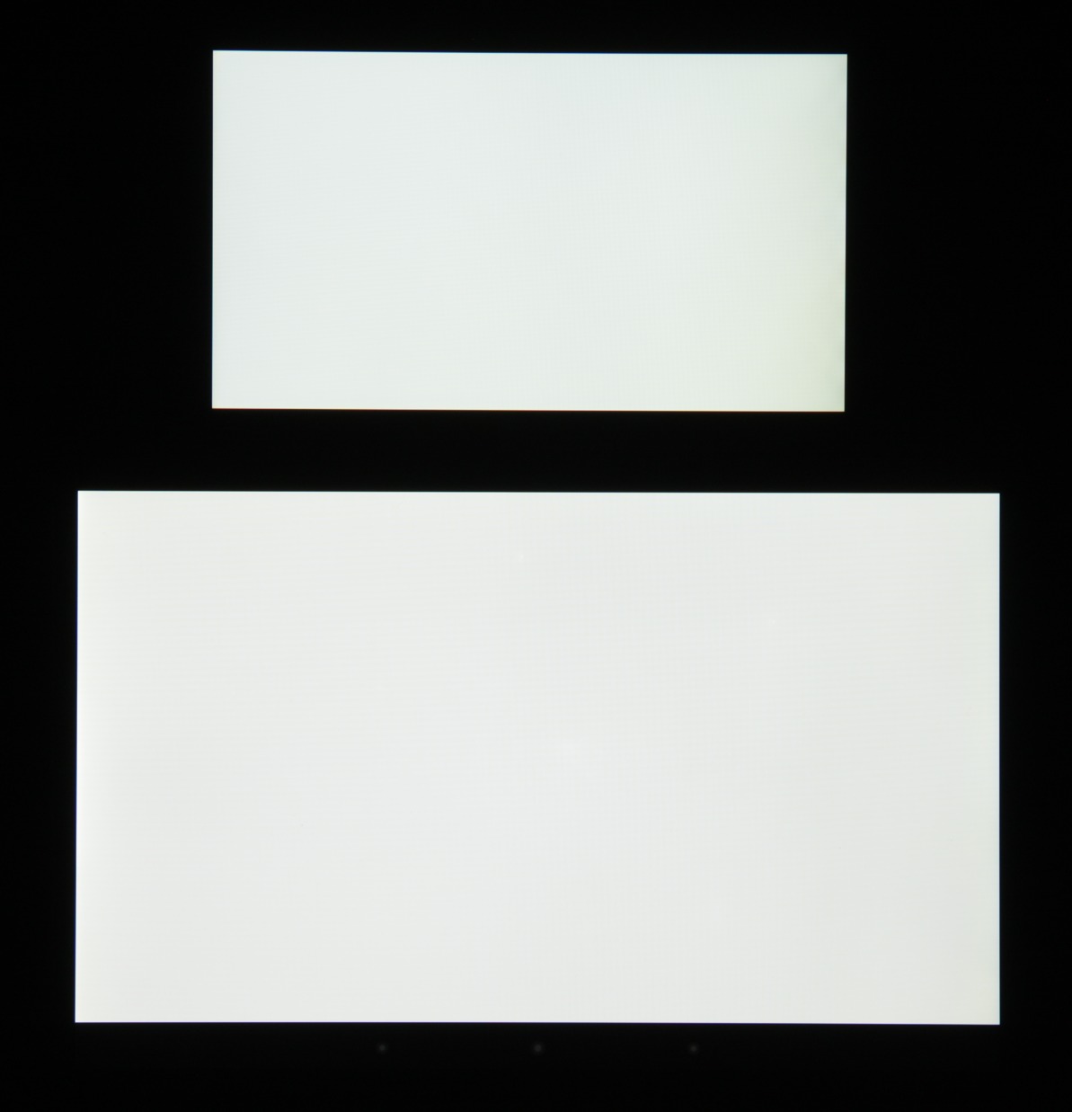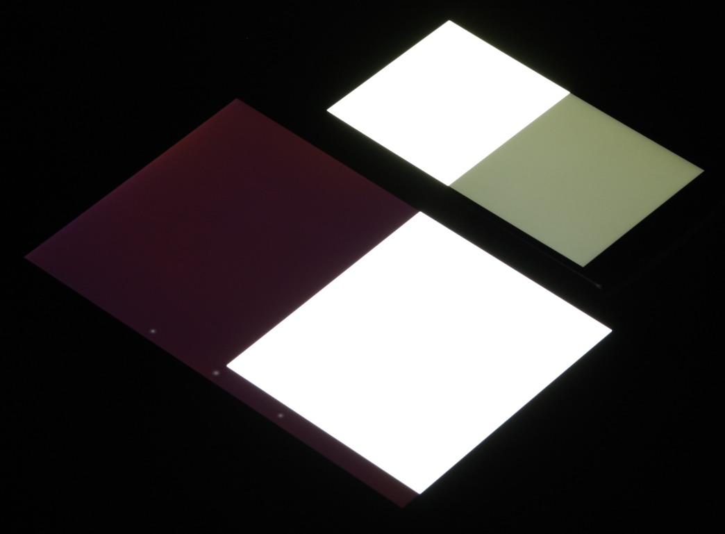 Яркость под углом у экранов уменьшилась (как минимум в пять раз, исходя из разницы в выдержке), однако в случае LG Spirit яркость снизилась чуть меньше. Черное поле при отклонении по диагонали высветляется сильно, но остается условно нейтрально-серым по оттенку. Фотографии ниже это демонстрируют (яркость белых участков в перпендикулярном плоскости экранов направлении у экранов одинаковая!):