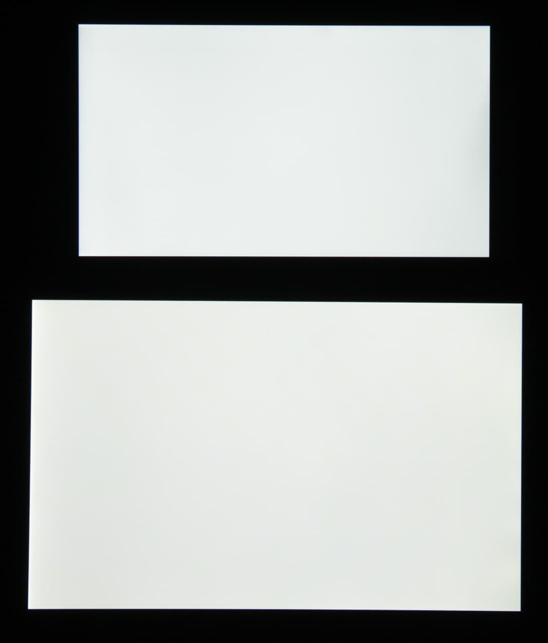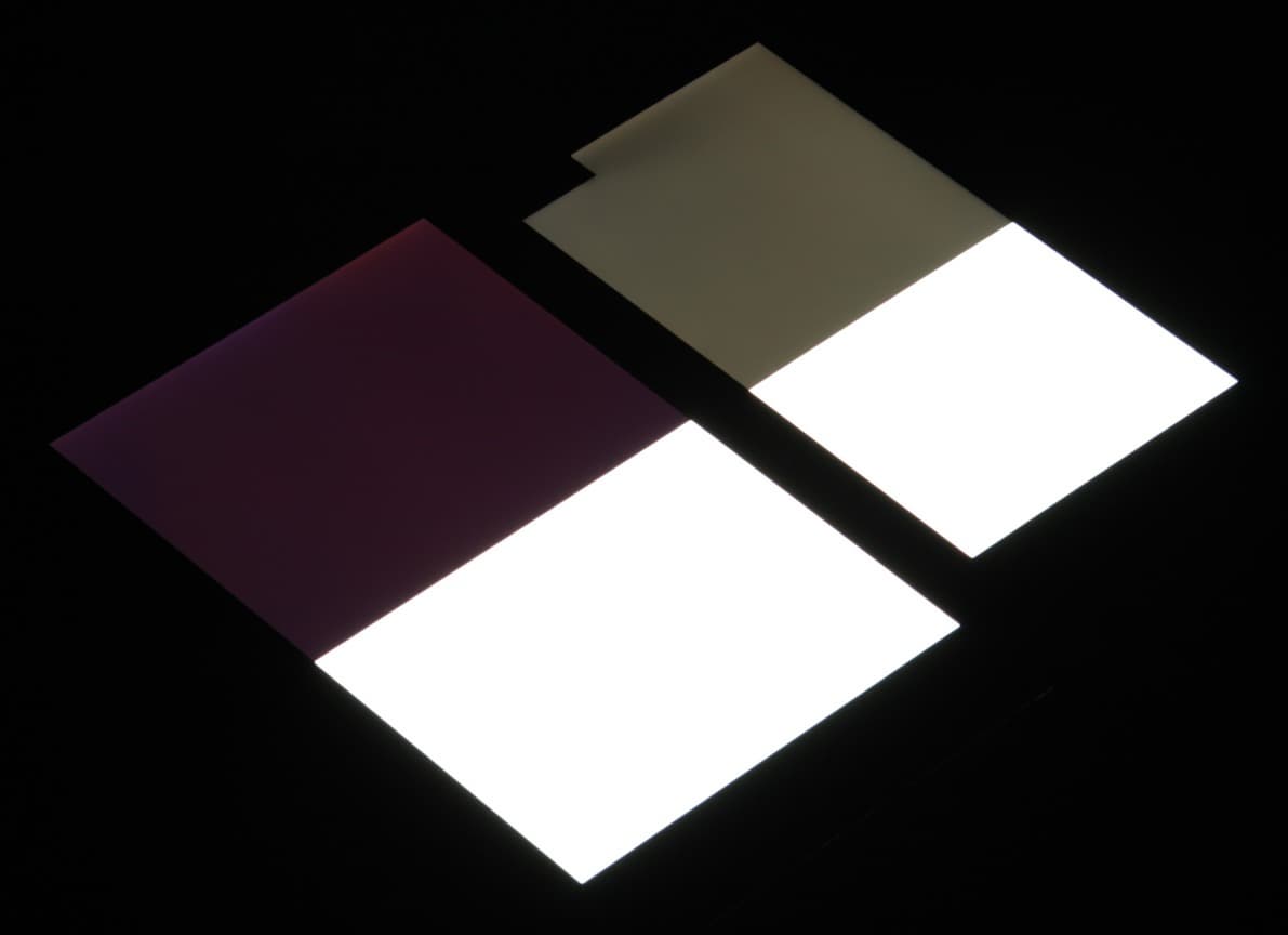 Яркость под углом у экранов уменьшилась (как минимум в пять раз, исходя из разницы в выдержке), однако в случае LG V10 яркость снизилась в большей степени. Черное поле при отклонении по диагонали высветляется сильно, но остается условно нейтрально-серым по оттенку. Фотографии ниже это демонстрируют (яркость белых участков в перпендикулярном плоскости экранов направлении у экранов одинаковая!):