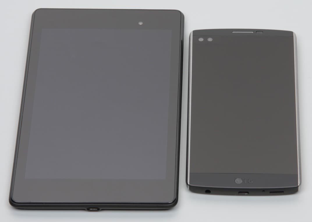 Лицевая поверхность экрана выполнена в виде стеклянной пластины с зеркально-гладкой поверхностью, устойчивой к появлению царапин. Судя по отражению объектов антибликовые свойства экрана лучше, чем у экрана Google Nexus 7 (2013) (далее просто Nexus 7). Для наглядности приведем фотографию, на которой в выключенных экранах отражается белая поверхность (слева — Nexus 7, справа — LG V10, ниже их можно различать по размеру):