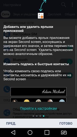 Работает это просто: маленький экран тоже сенсорный, достаточно подержать на нем палец, как откроется раздел его настроек, где можно выбрать, какие из функций использовать, а какие отключить. Например, на один из рабочих столов второго дисплея можно вывести список задач из календаря, на другой — интерфейс управления музыкальным проигрывателем, на третий — иконки быстрых контактов, и так далее. После этого рабочие столы пролистываются по кругу один за другим горизонтальным жестом. По умолчанию на этом месте красуется личная подпись владельца, взятая из настроек аккаунта Google.