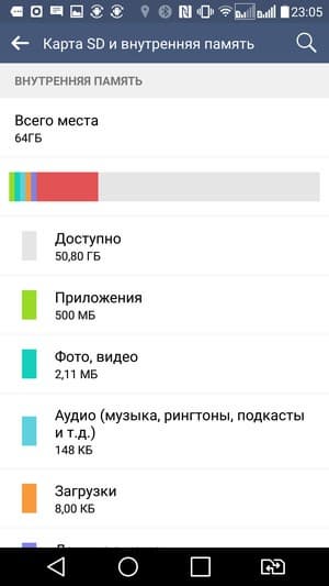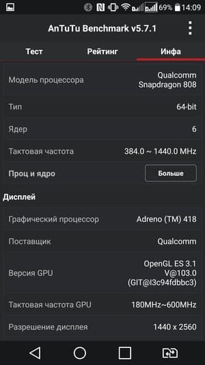 В Snapdragon 808 используется GPU Adreno 418 с частотой ядер до 600 МГц, поддерживается OpenGL ES 3.1. Объем оперативной памяти составляет целых 4 ГБ. Для нужд пользователя в устройстве доступно около 51 ГБ флэш-памяти из 64 номинальных. Память можно расширить за счет установки карт microSD объемом до 2 ТБ. На практике наша проверочная карта Transcend Premium microSDXC UHS-1 объемом 128 ГБ уверенно распозналась устройством. Также смартфон поддерживает подключение внешних устройств в режиме USB OTG.