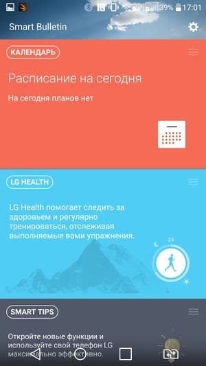 В остальном же, по внешнему виду и по внутренней организации это все та же UX 4.0, которая появилась в LG G4. Все предыдущие наработки представлены и в этой версии оболочки. Самый левый экран рабочего стола отдан под виджеты с информацией, индивидуально настраиваемой под пользовательские предпочтения — LG Health, Smart Tips, Smart Notice, объединенные общим названием Smart Bulletin (при желании отключается в настройках). Есть возможность работать в двухоконном режиме, уменьшать в размерах и перемещать на рабочем экране окна с приложениями в режиме QSlide, инфракрасный порт дополнен специальной программой для дистанционного управления бытовой техникой Smart Remote.