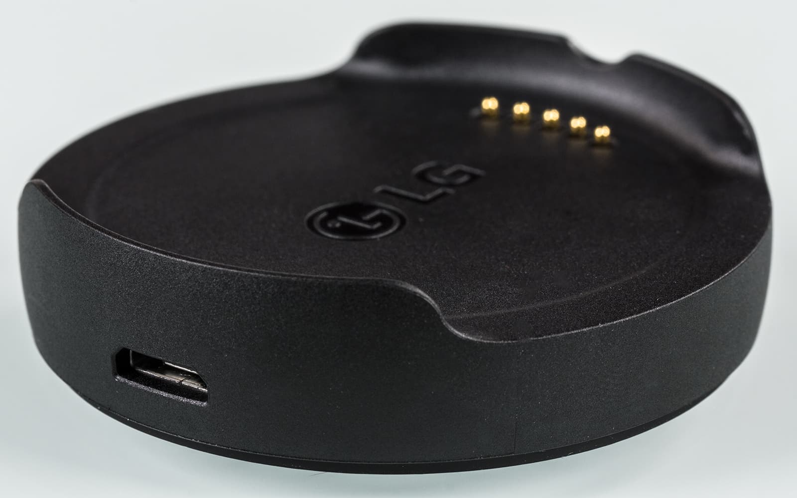 Она функционирует точно так же, как у LG G Watch и LG G Watch R. То есть это мини-платформа, на которую надо просто положить часы, совместив контакты, чтобы получилась вот такая конструкция (крэдл примагничивается к часам, поэтому не требуется никаких защелок, как у Samsung).