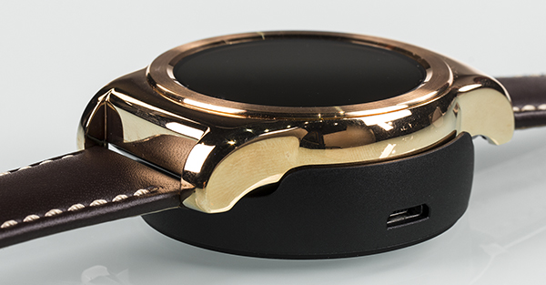 На боковой поверхности крэдла мы видим разъем Micro-USB. К нему и подключаем любое смартфонное зарядное устройство. В принципе, привычное (в том числе и по LG G Watch R) и достаточно удобное решение, хотя, конечно, менее эффектное, чем у Moto 360, где в комплекте поставляется полноценная док-станция для беспроводной зарядки, на которую часы можно просто положить, не думая о совмещении контактов.