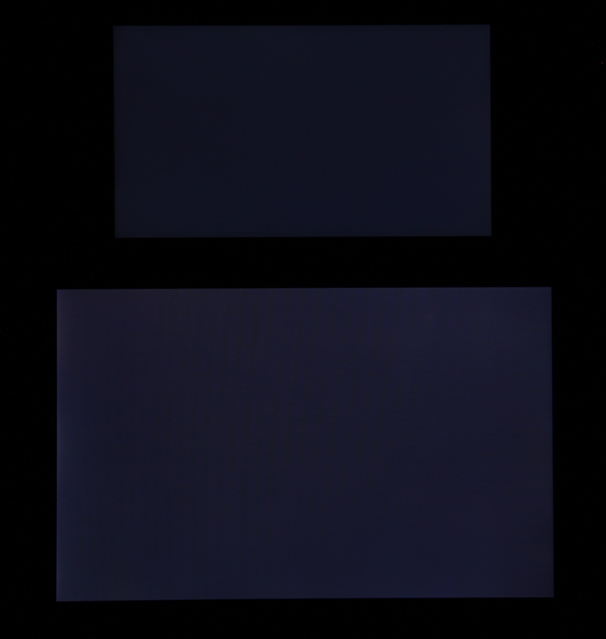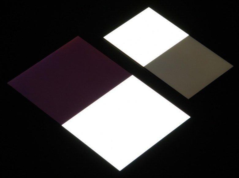 Яркость под углом у экранов уменьшилась (как минимум в 4 раза, исходя из разницы в выдержке), но у LG X venture экран все же немного светлее. Черное поле при отклонении по диагонали высветляется сильно и приобретает чуть красноватый оттенок. Фотографии ниже это демонстрируют (яркость белых участков в перпендикулярном плоскости экранов направлении одинаковая!):