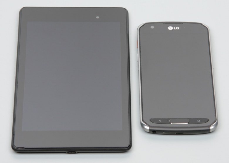 Лицевая поверхность экрана выполнена в виде стеклянной пластины с зеркально-гладкой поверхностью, устойчивой к появлению царапин. Судя по отражению объектов, антибликовые свойства экрана не хуже, чем у экрана Google Nexus 7 (2013) (далее просто Nexus 7). Для наглядности приведем фотографию, на которой в выключенных экранах отражается белая поверхность (слева — Nexus 7, справа — LG X venture, далее их можно различать по размеру):