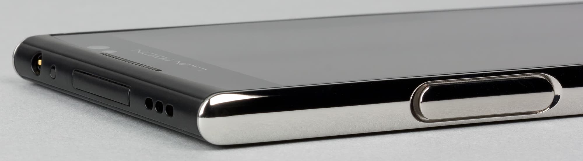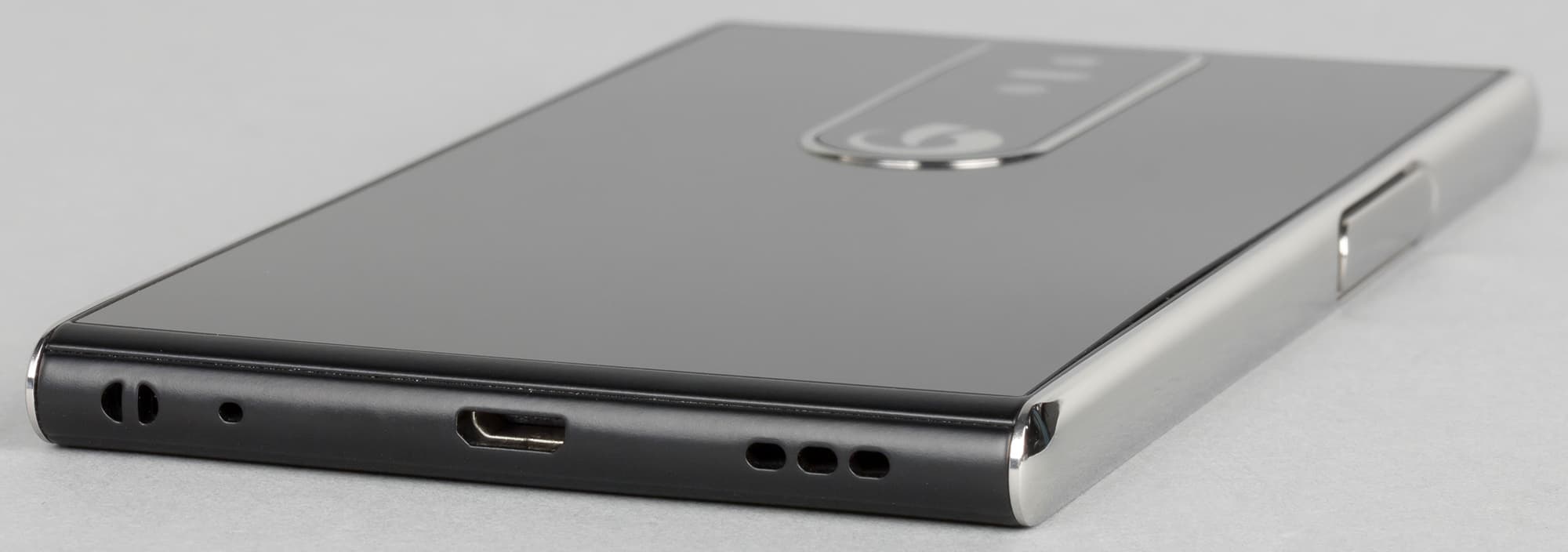 На верхний и нижний торцы выведены динамики, здесь их (основных) два, поэтому смартфон может похвастать стереозвуком. В то же время издаваемый ими звук не показался таким уж густым и насыщенным, хотя к чистоте и громкости звучания претензий нет. Кроме того, на верхнем торце расположены 3,5-миллиметровый выход на наушники и глазок инфракрасного передатчика для эмуляции пульта ДУ, а на нижнем — разъем Micro-USB и, неожиданно, крепеж для ремешка — давно всеми забытая, но удобная штука.