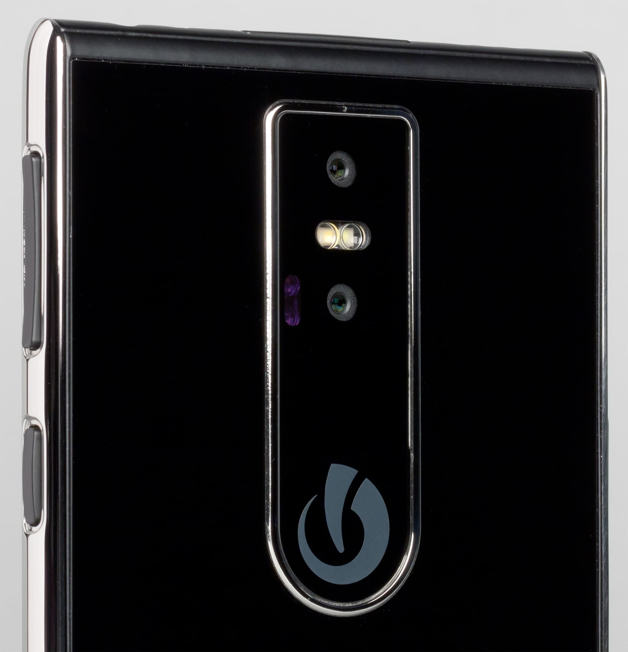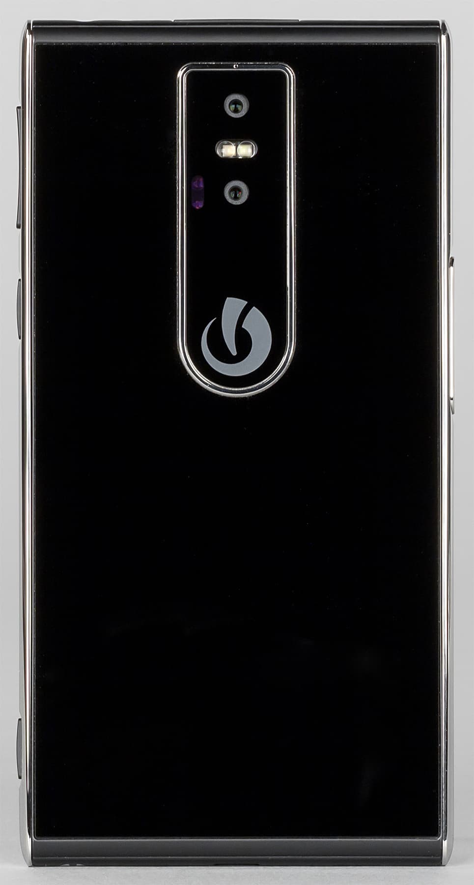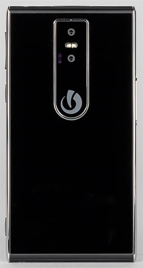 Тыльная сторона, как и передняя панель, прикрыта плоским защитным стеклом без 2.5D-эффекта. Все элементы на задней панели объединены в единый, чуть выпирающий наружу модуль. В него встроены две камеры: одна обычная, со сдвоенной двухтональной вспышкой, а другую разработчик обозначил как «камеру ночного видения с двойной ИК-вспышкой». Помимо этого, в модуль вписана сенсорная площадка, с помощью которой можно перелистывать веб-страницы и фотографии в галерее. Все эти элементы врезаны почти вровень со стеклом панели, поэтому смартфон на столе лежит устойчиво, не покачивается при прикосновениях к экрану.