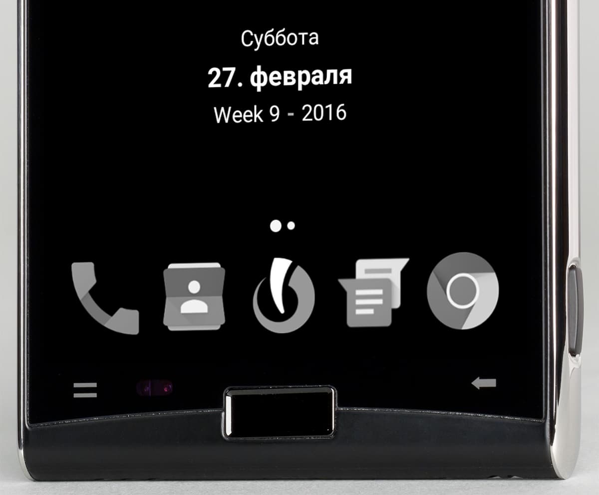 Пятая клавиша расположена более привычно и логично. Это площадка под экраном на фронтальной стороне корпуса со вписанным в нее дактилоскопическим датчиком. Кнопка небольшая, не выпирает за пределы поверхности, для активации сканера отпечатков пальцев обязательно требуется нажатие, одного прикосновения недостаточно. К работе сканера претензий нет, распознавание происходит четко, быстро и практически безошибочно. По бокам от механической клавиши установлены две сенсорные кнопки с соответствующими пиктограммами.