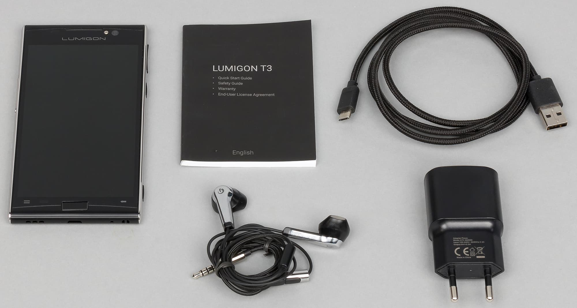 Упаковка у Lumigon T3, как того и требует премиальный уровень, стильно оформлена и аккуратно выполнена из твердого матового черного картона с текстурированностью под ткань, с единственным выдавленным на верхней крышке логотипом, без каких-либо надписей и картинок. Внутри все также аккуратно разложено по отдельным ячейкам на бархатистых подносиках. В целом знакомство с упаковкой смартфона оставило приятные впечатления.