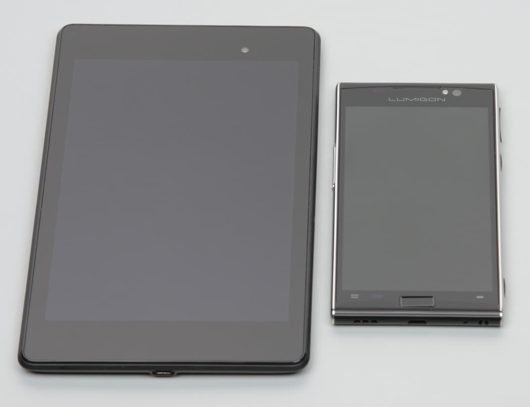 Лицевая поверхность экрана выполнена в виде стеклянной пластины с зеркально-гладкой поверхностью, устойчивой к появлению царапин. Судя по отражению объектов антибликовые свойства экрана не хуже, чем у экрана Google Nexus 7 (2013) (ниже просто Nexus 7). Для наглядности приведем фотографию, на которой в выключенных экранах отражается белая поверхность (слева — Nexus 7, справа — Lumigon T3, далее их можно различать по размеру):