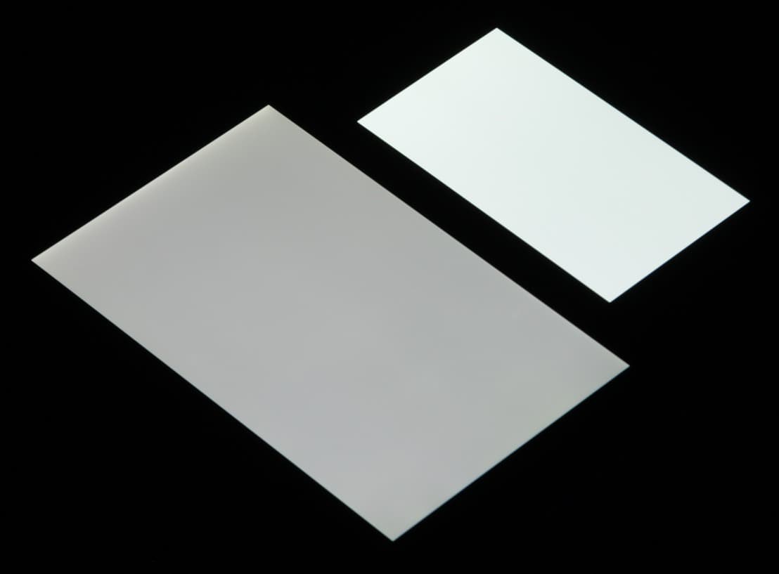 Экран характеризуется великолепными углами обзора. Правда, белый цвет при отклонении даже на небольшие углы приобретает легкий сине-зеленый оттенок, но черный цвет остается просто черным под любыми углами. Он настолько черный, что параметр контрастности в данном случае просто неприменим. При перпендикулярном взгляде равномерность белого поля хорошая. Для сравнения приведем фотографии, на которых на экраны Lumigon T3 и второго участника сравнения выведены одинаковые изображения, при этом яркость экранов изначально установлена примерно на 200 кд/м², а цветовой баланс на фотоаппарате принудительно переключен на 6500 К.