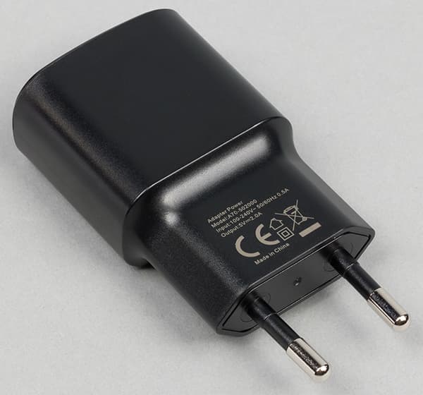 Комплект состоит из соединительного кабеля с тканевой оплеткой, компактного сетевого адаптера с выходным током и напряжением 2 А 5 В и проводной стереогарнитуры с каплевидными наушниками без резиновых насадок.