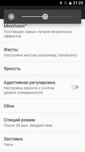 Яркость дисплея можно подстраивать вручную или задавать автоматические настройки, основанные на работе датчика внешнего освещения. Тест AnTuTu диагностирует поддержку 10 одновременных касаний мультитач. Есть возможность активации экрана двойным постукиванием.