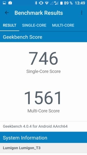 Несъемная аккумуляторная батарея, установленная в Lumigon T3, имеет, по всей видимости, небольшую емкость, поэтому реальный ее объем производитель старательно скрывает. По неподтвержденным данным, емкость батареи может составлять около 2400 мА·ч, а тестовые программы оценивают ее как 2285 мА·ч. В любом случае смартфон демонстрирует довольно скромный уровень автономности, это явно не сильная сторона аппарата.