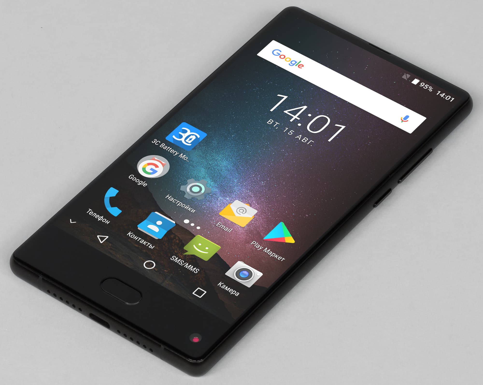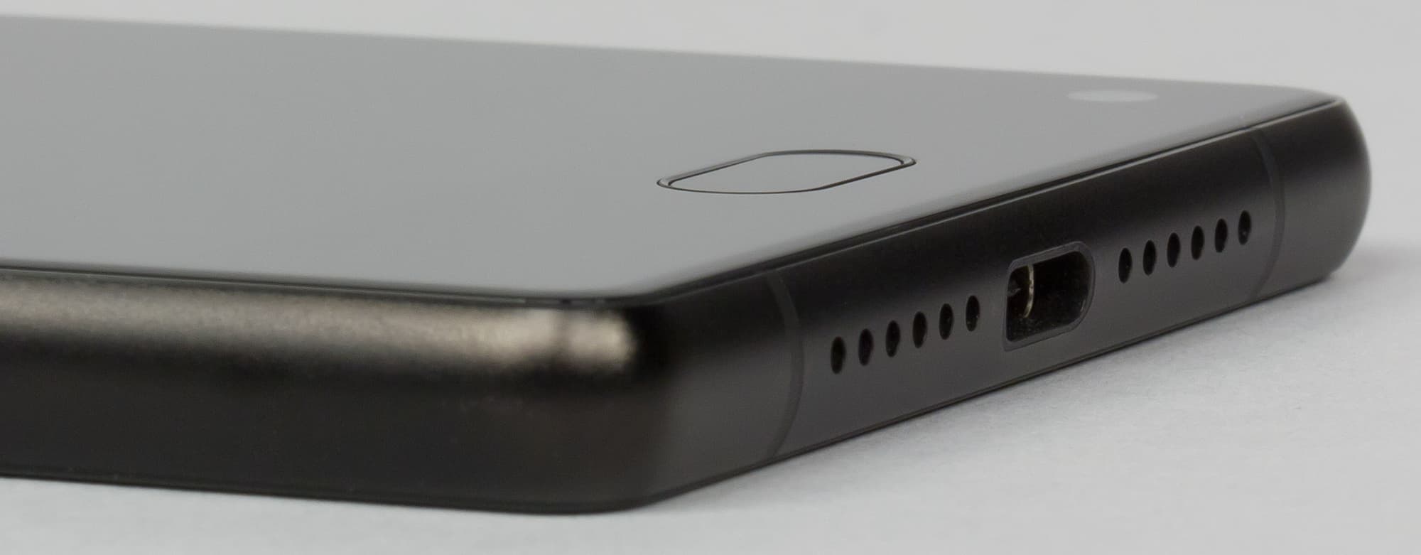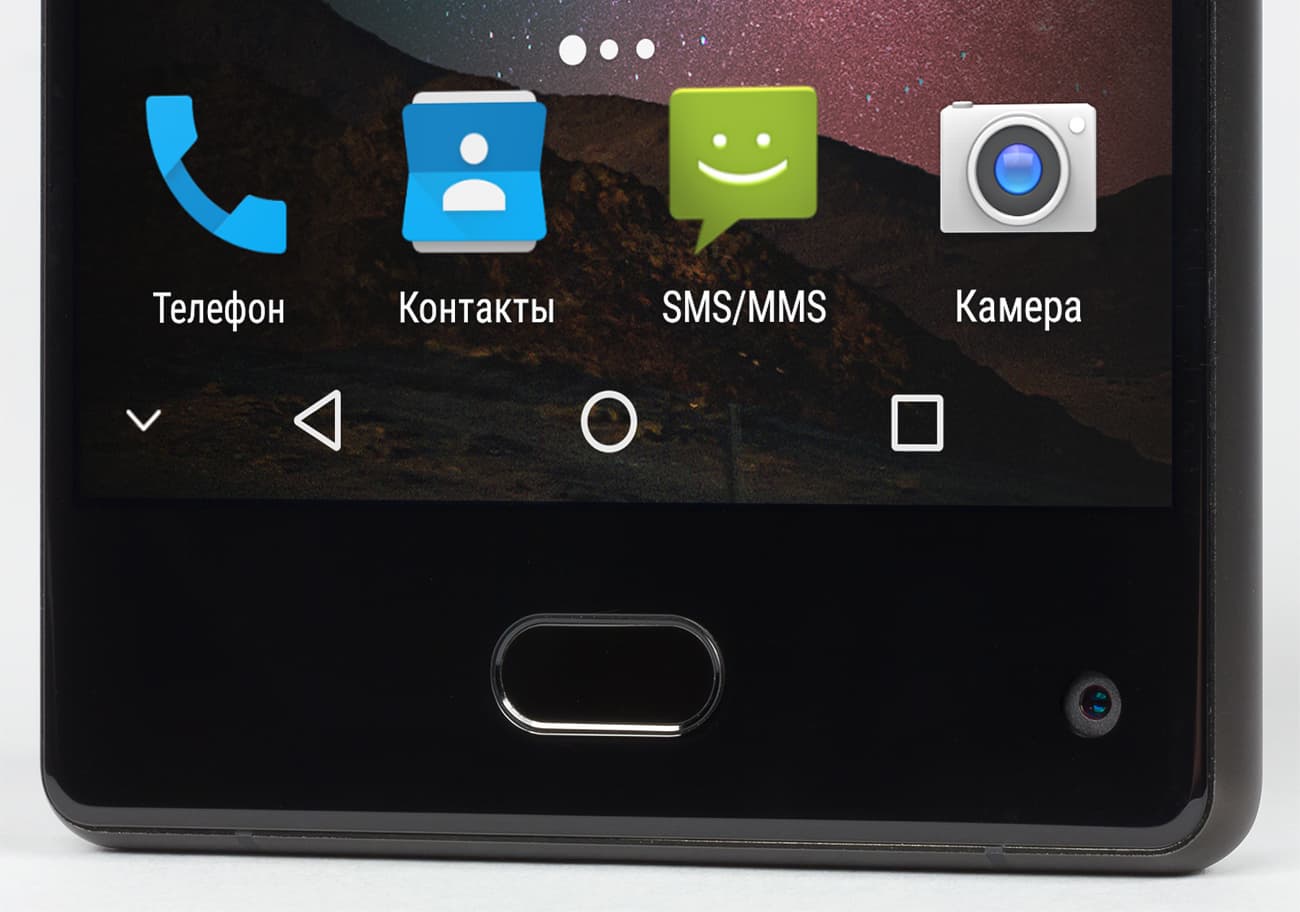Под экраном можно обнаружить сенсорную площадку со вписанным в нее сканером отпечатков пальцев. Эта кнопка также может отрабатывать функцию возврата к предыдущему экрану, но двух стандартных кнопок по бокам от нее нет. Фактически, управлять смартфоном приходится с помощью экранной панели кнопок, ее можно штатно прятать и вызывать обратно. Сканер отпечатков работает нормально: не молниеносно, но стабильно, практически без ошибок.