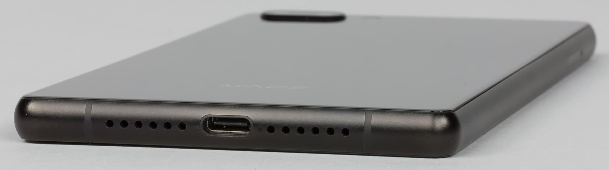 В нижний торец выведен основной динамик, и вот здесь ради симметрии даже проделаны лишние отверстия в корпусе (как обычно, один ряд отверстий бутафорский). Здесь же находится разъем USB Type-C, поддерживающий подключение внешних устройств в режиме USB OTG.