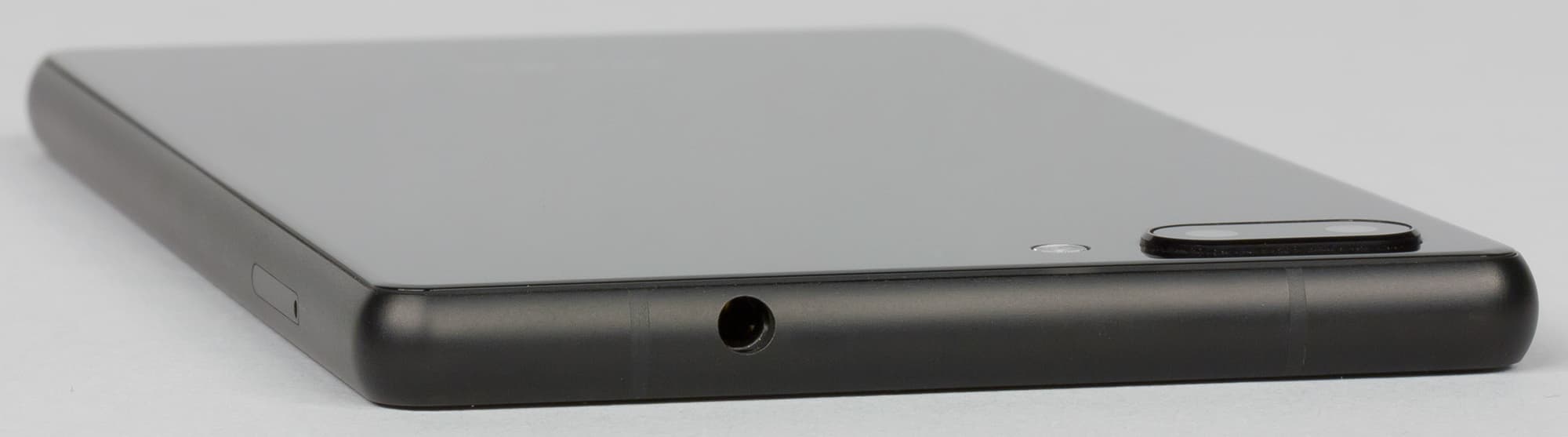 А вот верхний торец вызывает чувство глубокого недоумения: ну как можно было настолько криво проделать в металле отверстие под гнездо для наушников?! На крупном аппарате с широкой рамкой промах относительно продольной оси не скроешь, асимметричность так и бросается в глаза. Почему нельзя было прорезать отверстие ровно посередине и сделать все красиво?