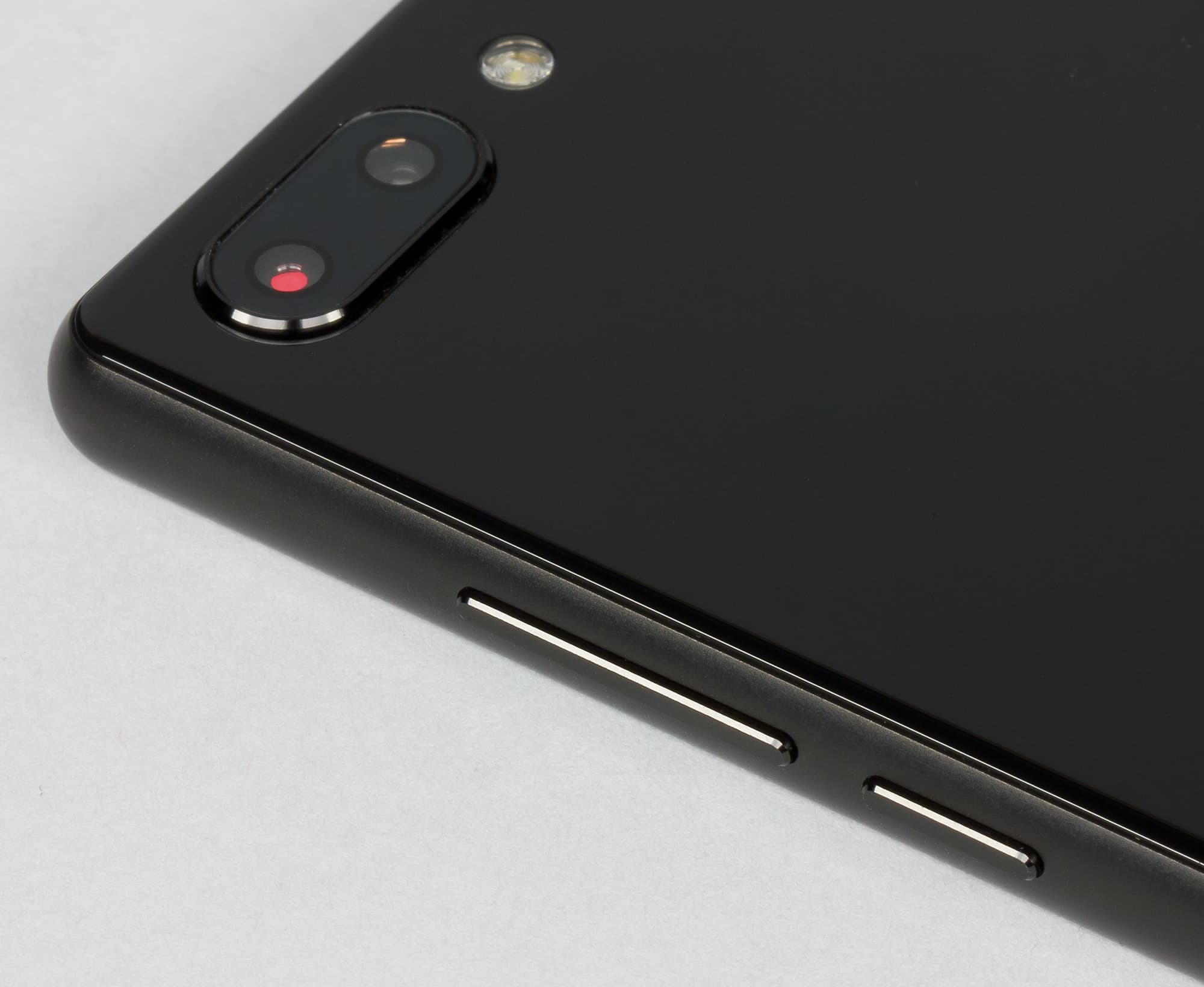 Модуль двойной камеры здесь заметно выпирает за пределы поверхности, поэтому с лежащим на столе смартфоном работать не слишком удобно, он покачивается при прикосновениях к экрану. Установленная рядом светодиодная вспышка очень яркая, хотя и имеет лишь один диод.