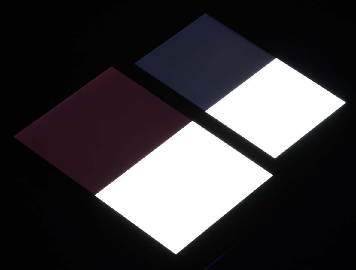 Яркость под углом у экранов уменьшилась (как минимум в 4 раза, исходя из разницы в выдержке), но у Maze Alpha снижение яркости меньше. Черное поле при отклонении по диагонали высветляется слабо и приобретает синеватый оттенок. Фотографии ниже это демонстрируют (яркость белых участков в перпендикулярном плоскости экранов направлении одинаковая!):