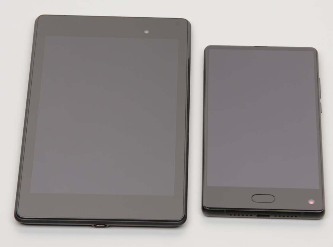 Лицевая поверхность экрана выполнена в виде стеклянной пластины с зеркально-гладкой поверхностью, устойчивой к появлению царапин. Судя по отражению объектов, антибликовые свойства экрана не хуже, чем у экрана Google Nexus 7 (2013) (далее просто Nexus 7). Для наглядности приведем фотографию, на которой в выключенных экранах отражается белая поверхность (слева — Nexus 7, справа — Maze Alpha, далее их можно различать по размеру):
