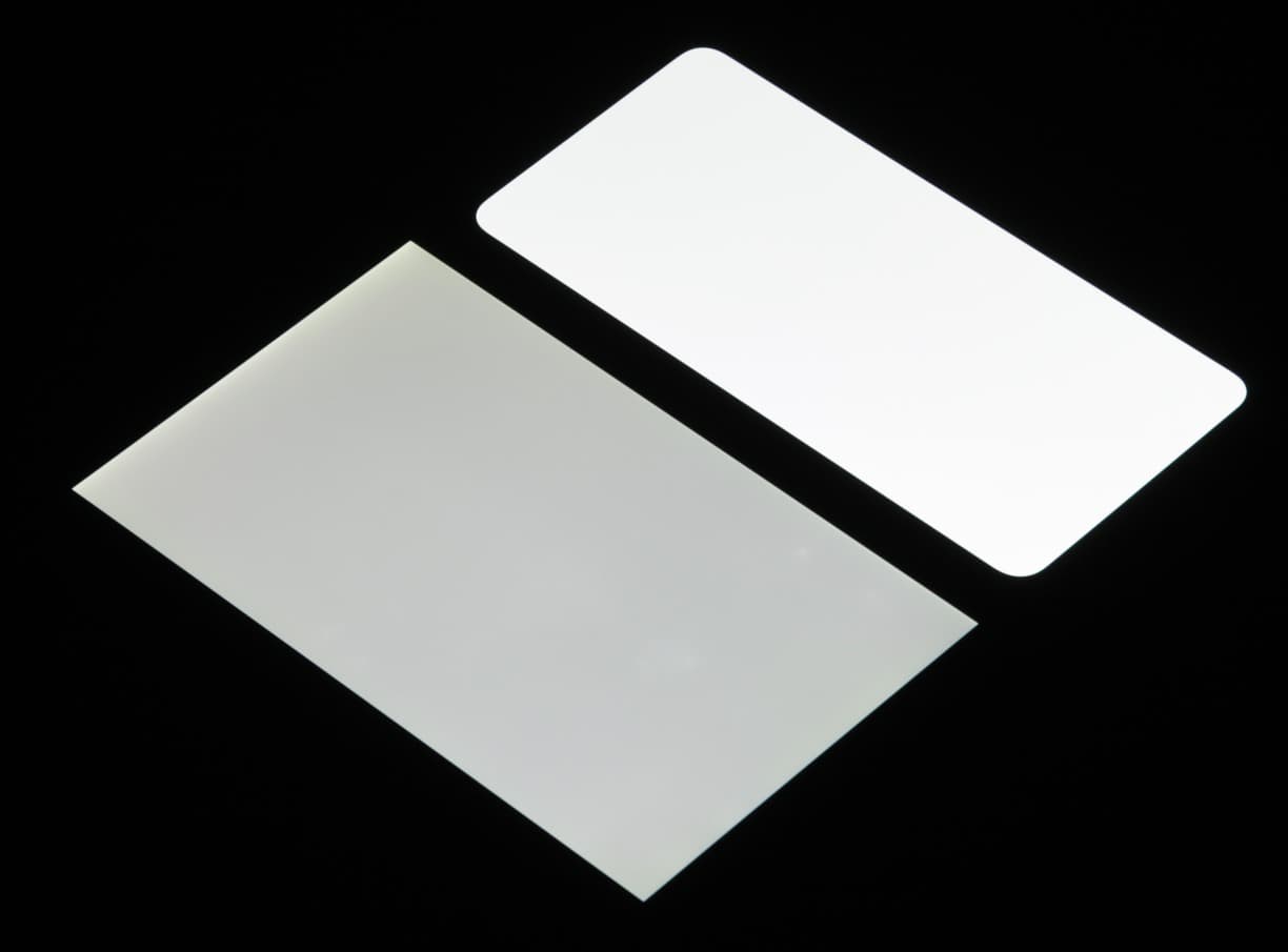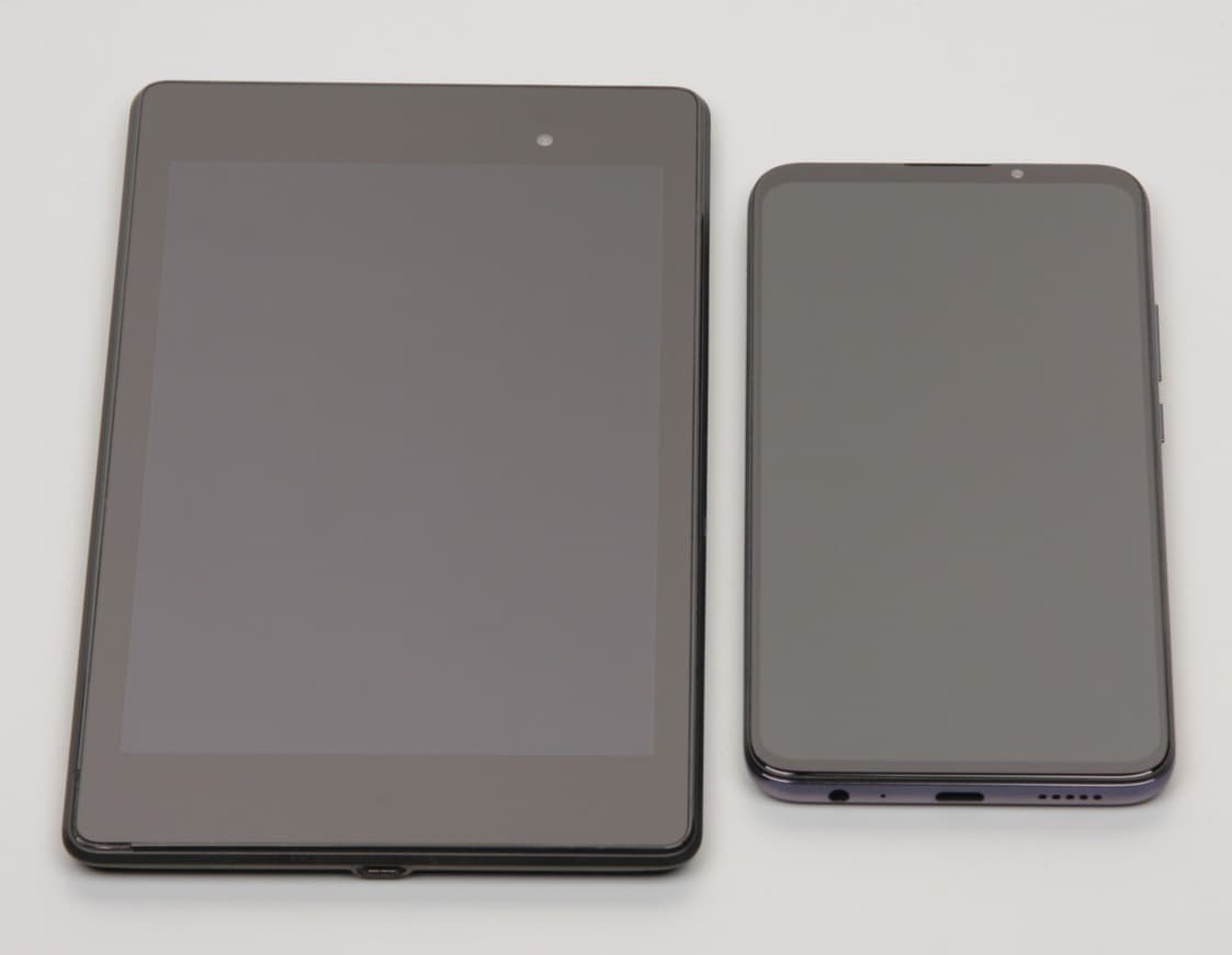 Лицевая поверхность экрана выполнена в виде стеклянной пластины с зеркально-гладкой поверхностью, устойчивой к появлению царапин. Судя по отражению объектов, антибликовые свойства экрана немного лучше, чем у экрана Google Nexus 7 (2013) (далее просто Nexus 7). Для наглядности приведем фотографию, на которой в выключенных экранах отражается белая поверхность (слева — Nexus 7, справа — Meizu 16T, далее их можно различать по размеру):