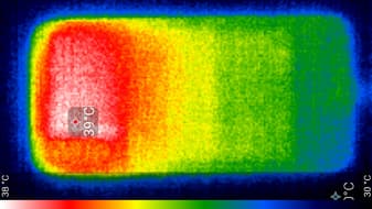 Нагрев относительно равномерный, но все же чуть больше локализован в верхней правой части аппарата, что, видимо, соответствует расположению микросхемы SoC. По данным теплокамеры, максимальный нагрев составил 39 градусов (при температуре окружающего воздуха в 24 градуса), это не очень много.