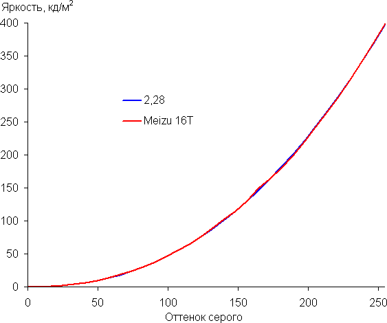 Напомним, что в случае OLED-экранов яркость фрагментов изображения динамично меняется в соответствии с характером выводимого изображения — уменьшается для светлых в целом изображений. В итоге полученная зависимость яркости от оттенка (гамма-кривая), скорее всего, немного не соответствует гамма-кривой статичного изображения, так как измерения проводились при последовательном выводе оттенков серого почти на весь экран.