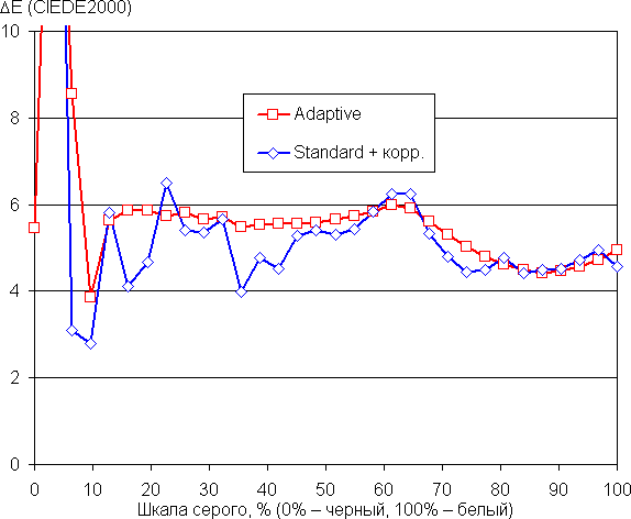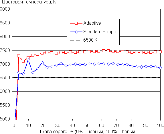 После небольшой коррекции (в случае профиля Standard) баланс оттенков на шкале серого уже хороший: цветовая температура близка к 6500 К (слишком большой шаг изменения не позволяет точнее установить цветовую температуру), а отклонение от спектра абсолютно черного тела (ΔE) на большей части шкалы серого остается ниже 10 единиц, что для потребительского устройства считается хорошим показателем. При этом на значимом участке шкалы серого цветовая температура и ΔE изменяются не очень сильно, что улучшает визуальное восприятие баланса цветов.