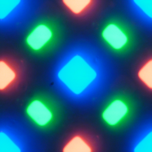 В этом экране используется матрица Super AMOLED — активная матрица на органических светодиодах. Полноцветное изображение создается с помощью субпикселей трех цветов — красного (R), зеленого (G) и синего (B), но красных и синих субпикселей в два раза меньше, что можно обозначить как RGBG. Это подтверждается фрагментом микрофотографии: