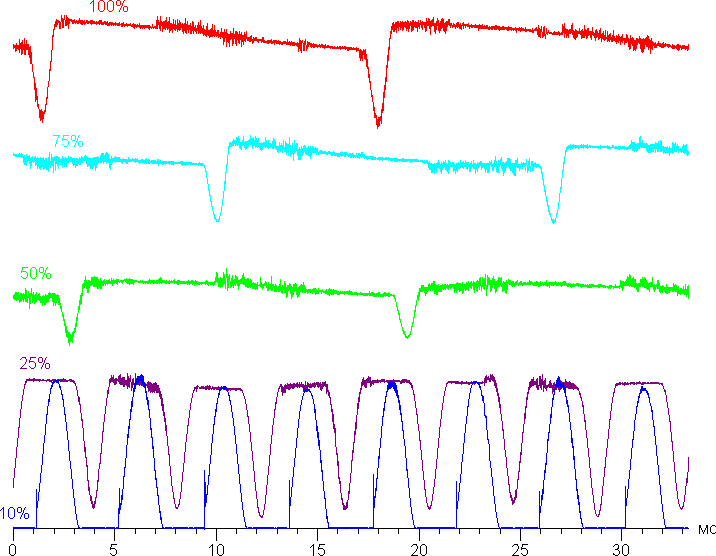 На любом уровне яркости присутствует значимая модуляция с частотой примерно 60 или 240 Гц. На рисунке ниже приведены зависимости яркости (вертикальная ось) от времени (горизонтальная ось) для нескольких значений настройки яркости: