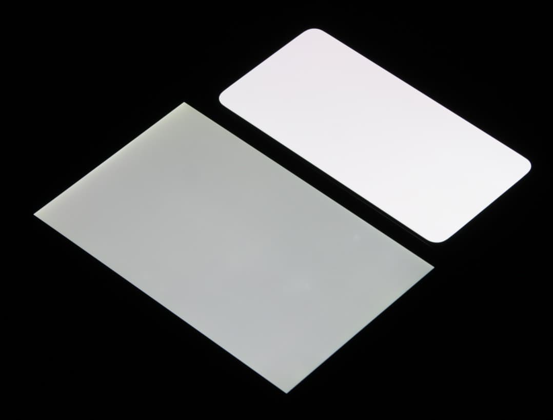 Лицевая поверхность экрана выполнена в виде стеклянной пластины с зеркально-гладкой поверхностью, устойчивой к появлению царапин. Судя по отражению объектов, антибликовые свойства экрана примерно как у экрана Google Nexus 7 (2013) (далее просто Nexus 7). Для наглядности приведем фотографию, на которой в выключенных экранах отражается белая поверхность (слева — Nexus 7, справа — Meizu 16th, далее их можно различать по размеру):