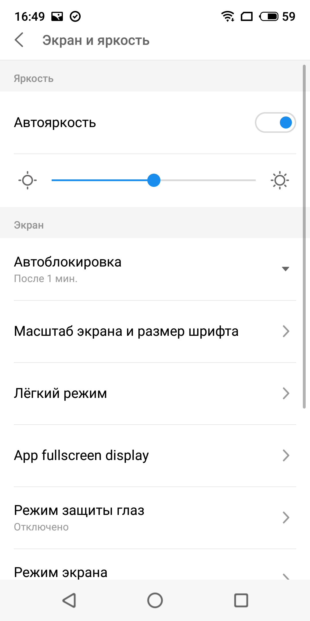 При выводе белого поля во весь экран и при ручном управлении яркостью ее максимальное значение составило 430 кд/м². Также нужно учитывать, что в данном случае чем меньше площадь белого на экране, тем он светлее, то есть фактическая максимальная яркость белых участков будет почти всегда выше указанного значения. В итоге читаемость днем на солнце должна быть на приемлемом уровне. Минимальное значение яркости белого — 1,8 кд/м², то есть пониженный уровень яркости без проблем позволяет использовать устройство даже в полной темноте. С другой стороны, минимальный уровень слишком уж низкий, и в некоторых случаях это может приводить к неприятным последствиям, затруднив определение того, что́ выводится на экран и включен ли он вообще. Работает автоматическая регулировка яркости по датчику освещенности (он расположен левее выреза фронтального громкоговорителя). Работа этой функции зависит от положения ползунка регулировки яркости. Если оставить все по умолчанию, на 50%, то в полной темноте функция автояркости уменьшает яркость до 3 кд/м² (очень темно), в условиях освещенного искусственным светом офиса (примерно 550 лк) устанавливает на 110 кд/м² (нормально), а условно под прямыми лучами солнца повышает до 430 кд/м². Результат нас не устроил, поэтому мы передвинули ползунок на примерно 65%, получив в итоге для трех условий, указанных выше, следующие значения: 15, 160 и 430 кд/м² (идеальное сочетание). Получается, что функция автоподстройки яркости работает адекватно и позволяет пользователю настраивать свою работу под индивидуальные требования.