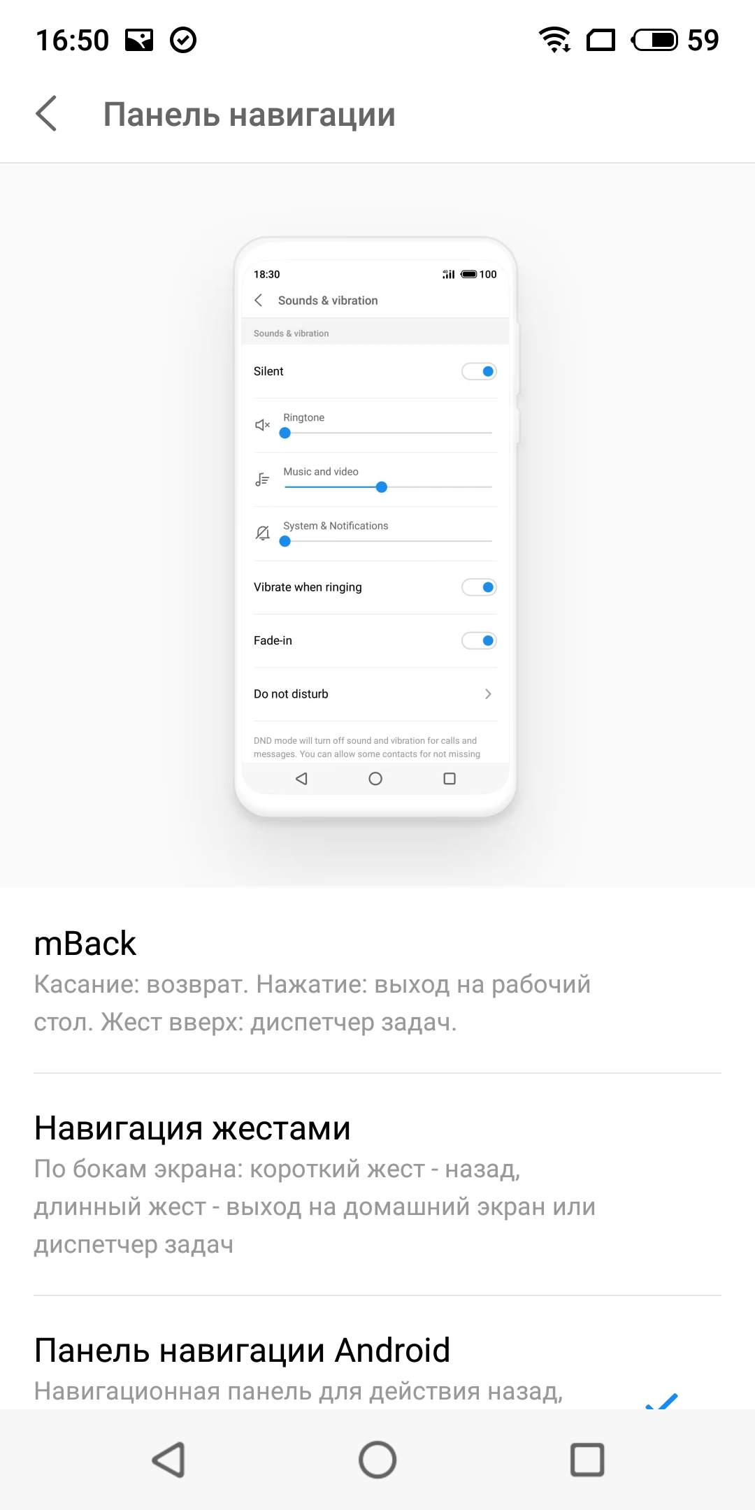 Фирменный способ навигации претерпел некоторые изменения и поэтому теперь называется Super mBack. Здесь к управлению с помощью кружка mBack добавлены жесты от краев нижней части экрана. Предусмотрительно сохранен и привычный трехкнопочный вариант навигации Android.
