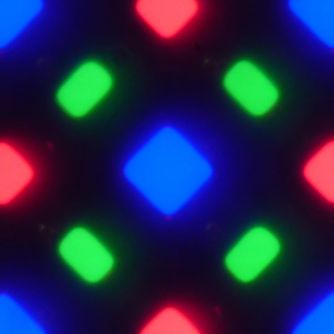 На фрагменте выше можно насчитать 4 зеленых субпикселя, 2 красных (4 половинки) и 2 синих (1 целый и 4 четвертушки), при этом, повторяя эти фрагменты, можно выложить весь экран без разрывов и перехлеста. Для таких матриц компания Samsung ввела наименование PenTile RGBG. Разрешение экрана производитель считает по зеленым субпикселям, по двум другим оно будет в два раза ниже. Разумеется, присутствуют некоторая неровность контрастных границ и другие артефакты изображения. Впрочем, из-за высокого разрешения они лишь минимально сказываются на качестве картинки.