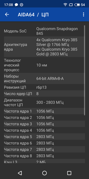 - SoC Qualcomm Snapdragon 845, 8 ядер (4 × Kryo 385 @2,8 ГГц + 4 × Kryo 385 @1,8 ГГц)