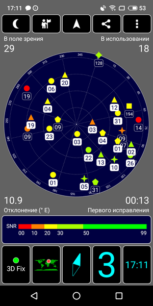 Навигационный модуль работает и с GPS (с A-GPS), и с отечественной Глонасс, и с китайской Beidou, и, кажется, со всеми остальными, введенными в строй или только планируемыми системами спутниковой навигации, включая европейский Galileo. Первые спутники даже при холодном старте обнаруживаются быстро, в течение первых же секунд, точность позиционирования не вызывает претензий. Магнитный компас, необходимый для навигационных программ, в смартфоне, естественно, имеется.