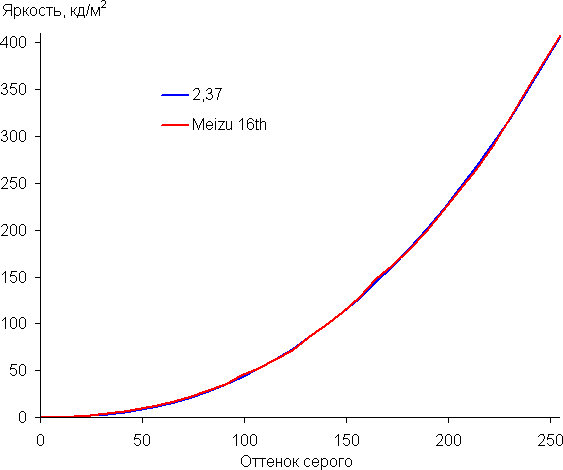 Напомним, что в случае OLED-экранов яркость фрагментов изображения динамично меняется в соответствии с характером выводимого изображения — уменьшается для светлых в целом изображений. В итоге полученная зависимость яркости от оттенка (гамма-кривая), скорее всего, немного не соответствует гамма-кривой статичного изображения, так как измерения проводились при последовательном выводе оттенков серого почти на весь экран.