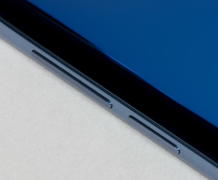 Основной динамик выведен в нижний торец, оба динамика (основной и разговорный) работают в стереорежиме. Также в нижнем торце разместились разъем USB Type-C и 3,5-миллиметровый аудиовыход на наушники.