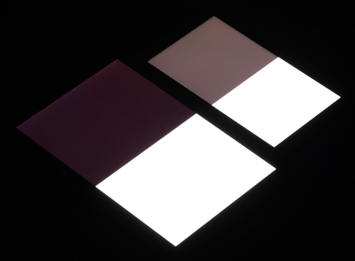 Яркость под углом у экранов уменьшилась (как минимум в 5 раз, исходя из разницы в выдержке), но у Meizu M3 Note экран все же немного темнее. Черное поле при отклонении по диагонали высветляется сильно и приобретает фиолетовый или красноватый оттенок. Фотографии ниже это демонстрируют (яркость белых участков в перпендикулярном плоскости экранов направлении одинаковая!):