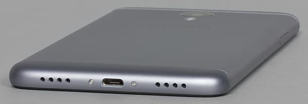 Основной динамик выведен в нижний торец, за одну из решеточек, в то время как вторая является бутафорией, звук через нее не выходит. Между двумя решетками расположен разъем Micro-USB, поддерживающий подключение внешних устройство в режиме USB OTG.