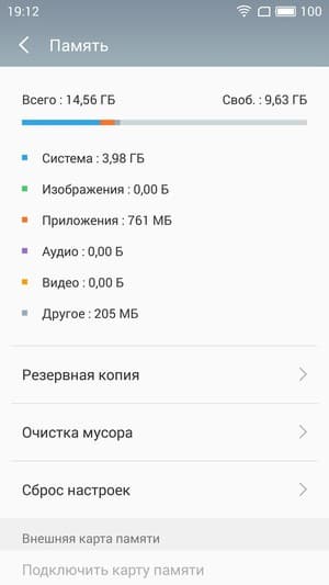 Объем оперативной памяти младшей модификации смартфона составляет 2 ГБ, объем встроенной флэш-памяти — 16 ГБ, из которых около 10,5 ГБ изначально доступны пользователю для его нужд. Этот объем можно увеличить за счет карт microSD. Также есть возможность подключать к порту USB внешние флэш-накопители в режиме OTG. Карты microSD поддерживаются емкостью до 128 ГБ, на практике наша проверочная карта Transcend Premium microSDXC UHS-1 объемом 128 ГБ уверенно распозналась устройством.