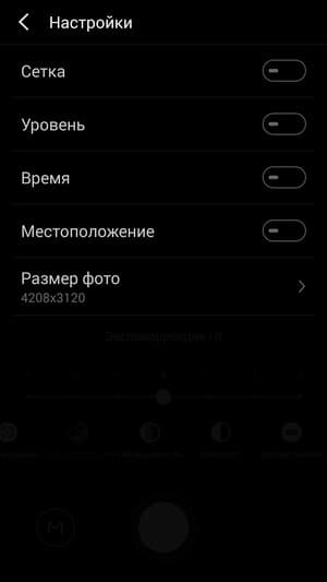 Оба модуля, судя по всему, тут установлены такие же, как в предыдущем смартфоне M2 Note, а меню управления камерой обновлено с выходом новых версий Flyme. В целом интерфейс практически тот же, но появилась возможность более однозначно выбирать размер и разрешение снимков и видео. Теперь это целый список из нескольких вариантов на выбор, а раньше можно было лишь двигать пару горизонтальных ползунков. В ручном режиме есть возможность выставлять светочувствительность, выдержку, экспокоррекцию, насыщенность, контраст и баланс белого; имеются дополнительные режимы — портретный, панорамный, макросъемка. Сторонним приложениям управление этими настройками через Camera2 API недоступно, нет возможности и сохранять снимки в RAW.