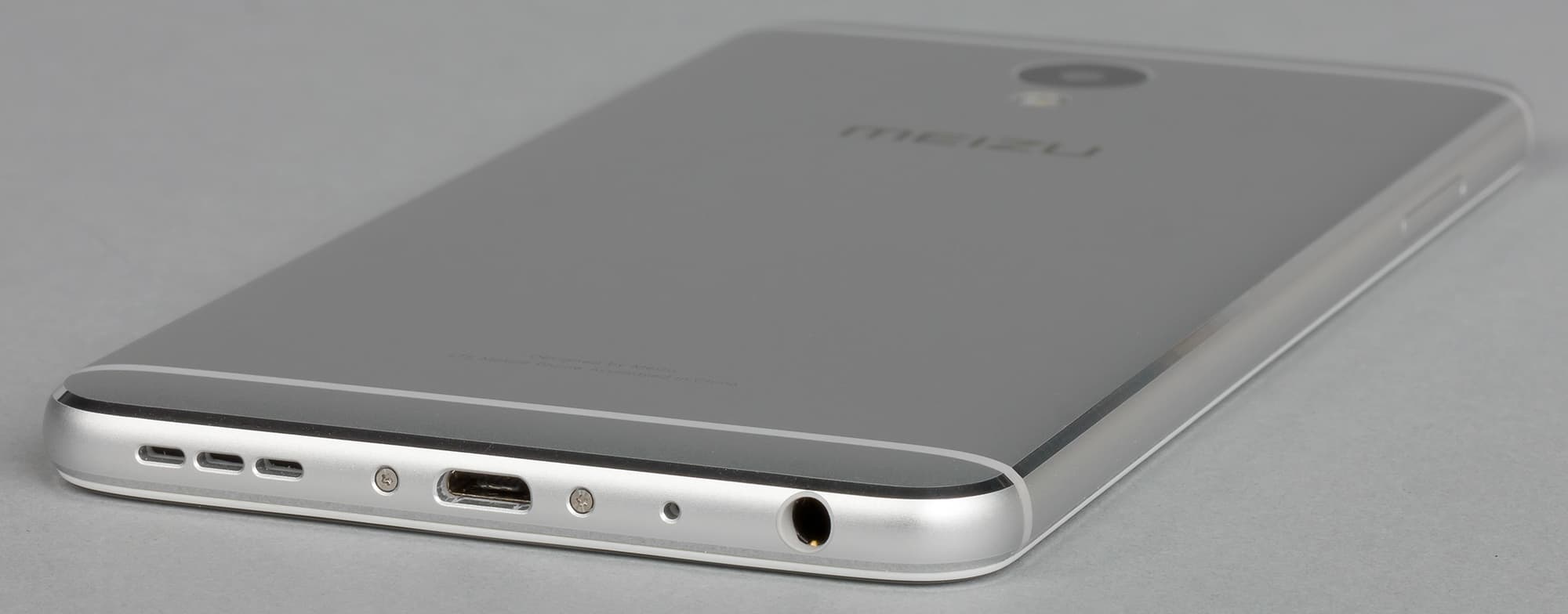 Основной динамик здесь выведен в нижний торец, его стандартно прикрывает решетка, образуемая тремя относительно крупными отверстиями в металле корпуса. Meizu, в отличие от многих, не стала оформлять нижний торец двумя симметричными решетками, одна из которых всегда является фальшивой. Для микрофона проделано небольшое круглое отверстие рядом. Любопытно, что здесь же, на нижнем торце, расположен не только традиционный порт USB (разъем Micro-USB), поддерживающий подключение внешних устройств в режиме USB OTG, но и 3.5-миллиметровый выход на наушники.