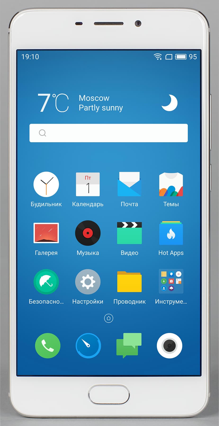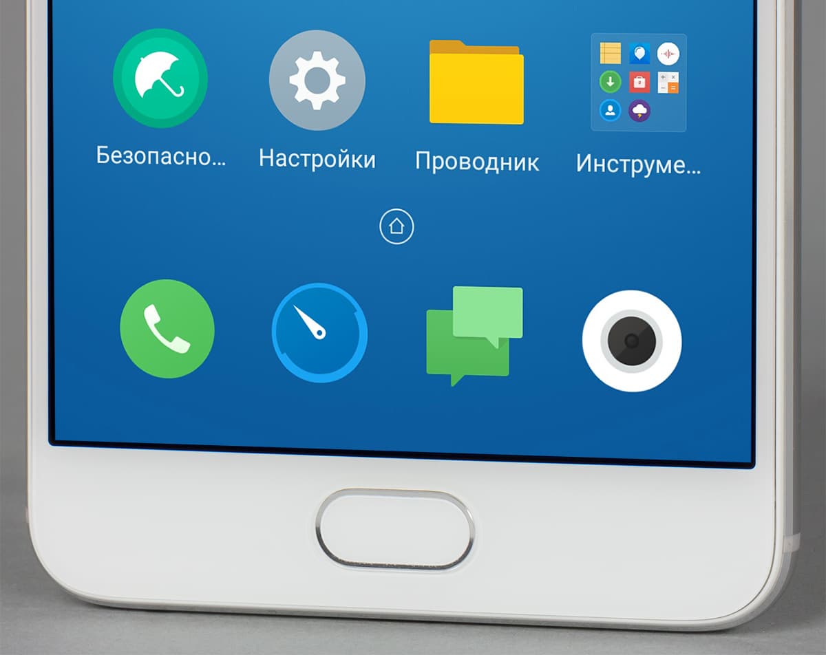 Все элементы размещены на корпусе в привычных для смартфонов Meizu местах. От большинства продуктов других производителей их отличает отсутствие двух сенсорных кнопок под экраном при наличии центральной клавиши. Обычно кнопок под экраном либо три, либо ни одной. Здесь же кнопка установлена лишь одна, но она даже более функциональна, чем у того же iPhone, поскольку поддерживает функцию возврата к предыдущему экрану по короткому прикосновению без нажатия. По нажатию же осуществляется разблокировка с помощью встроенного в клавишу сканера отпечатков пальцев. Сканер в нашем тестовом образце работал довольно странно, иногда ошибался, но это, пожалуй, можно списать на то, что у нас на тестировании побывал не серийный коммерческий продукт, а тестовый экземпляр. Положительный момент в том, что дактилоскопический датчик Meizu устанавливает не на задней стороне корпуса, а спереди, где до него легче достать в любом положении смартфона.