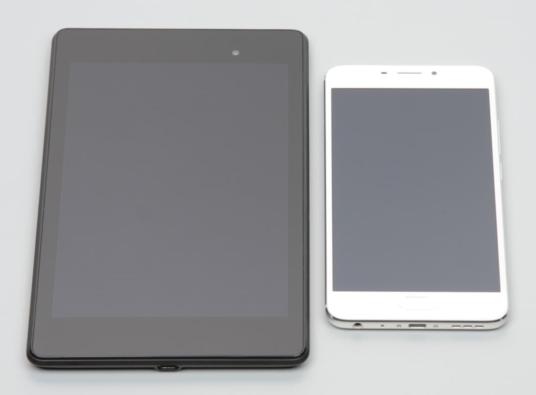 Лицевая поверхность экрана выполнена в виде стеклянной пластины с зеркально-гладкой поверхностью, устойчивой к появлению царапин. Судя по отражению объектов антибликовые свойства экрана чуть хуже, чем у экрана Google Nexus 7 (2013) (далее просто Nexus 7). Для наглядности приведем фотографию, на которой в выключенных экранах отражается белая поверхность (слева — Nexus 7, справа — Meizu M5 Note, далее их можно различать по размеру):