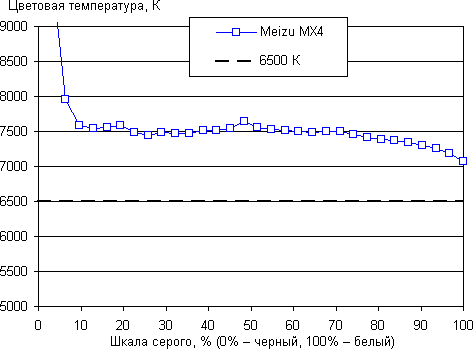 Баланс оттенков на шкале серого хороший, так как цветовая температура несильно выше стандартных 6500 К, а отклонение от спектра абсолютно черного тела (ΔE) меньше 10, что для потребительского устройства считается хорошим показателем. При этом хотя бы цветовая температура мало изменяется от оттенка к оттенку — это положительно сказывается на визуальной оценке цветового баланса. (Самые темные области шкалы серого можно не учитывать, так как там баланс цветов не имеет большого значения, да и погрешность измерений цветовых характеристик на низкой яркости большая.)